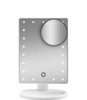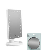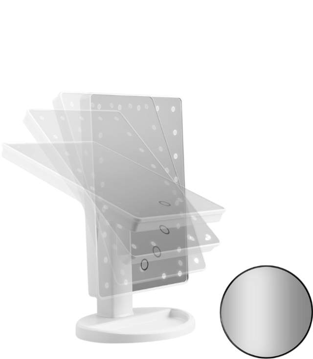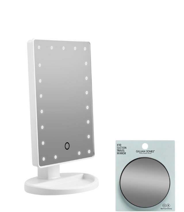 - Gillian Jones Spejl Hollywood med sugekop i hvid er et elegant spejl med LED-lys, der giver en naturlig belysning til makeup og hudpleje. Det minimalistiske design inkluderer en stabil base med opbevaringsplads, mens det medfølgende 10x forstørrelsesspejl med sugekop sikrer præcision og fleksibilitet.